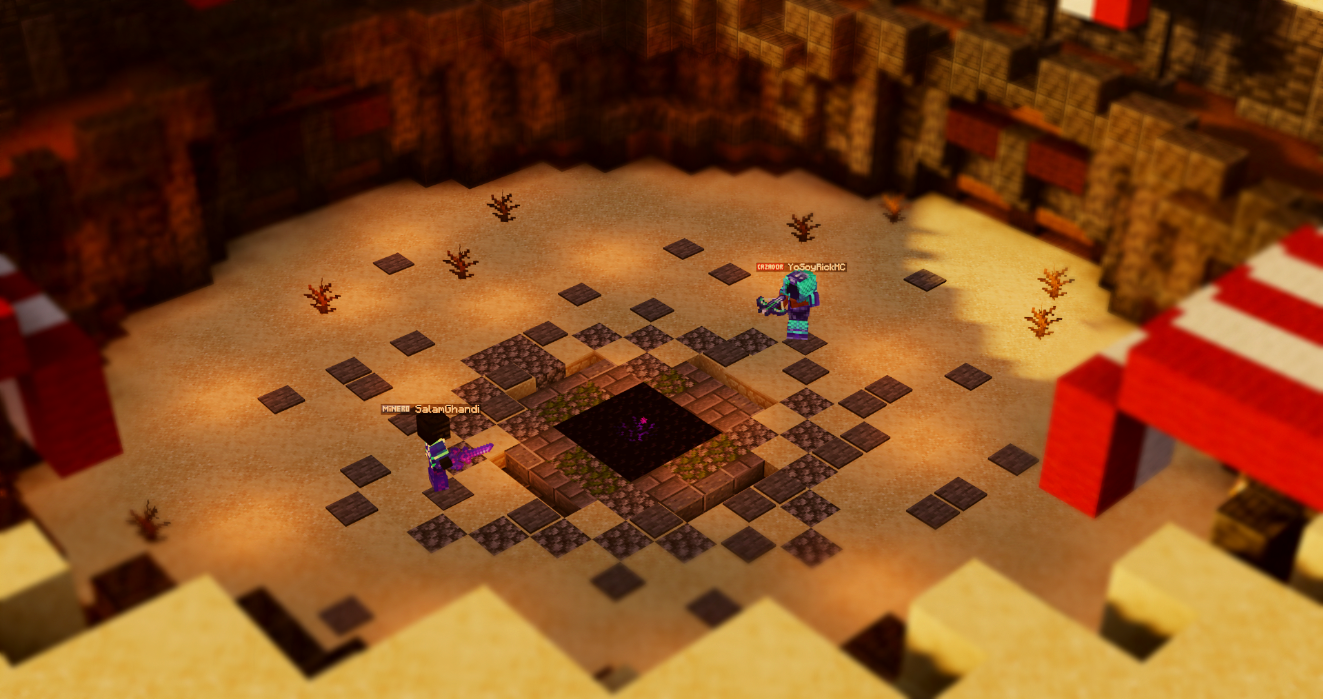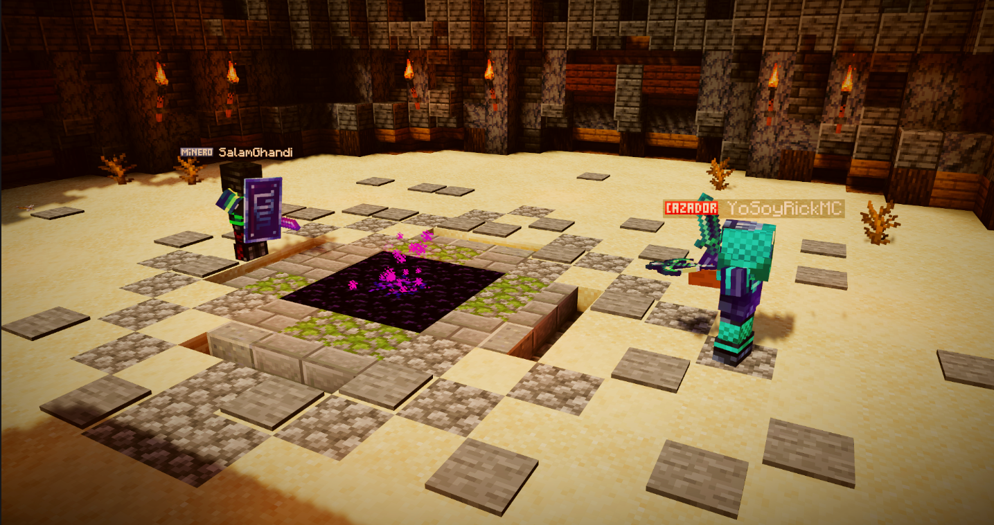 Dos jugadores peleando en una arena de clanes. Ubicada en Sylvara, uno de los mundos survival.