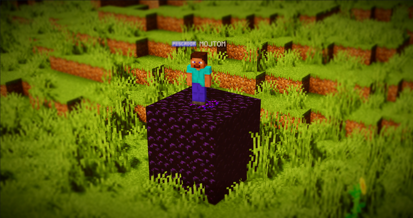 Jugador inaugurando su arena, parado justo en el centro de un bloque de obsidiana de 3x3x3 bloques de área.