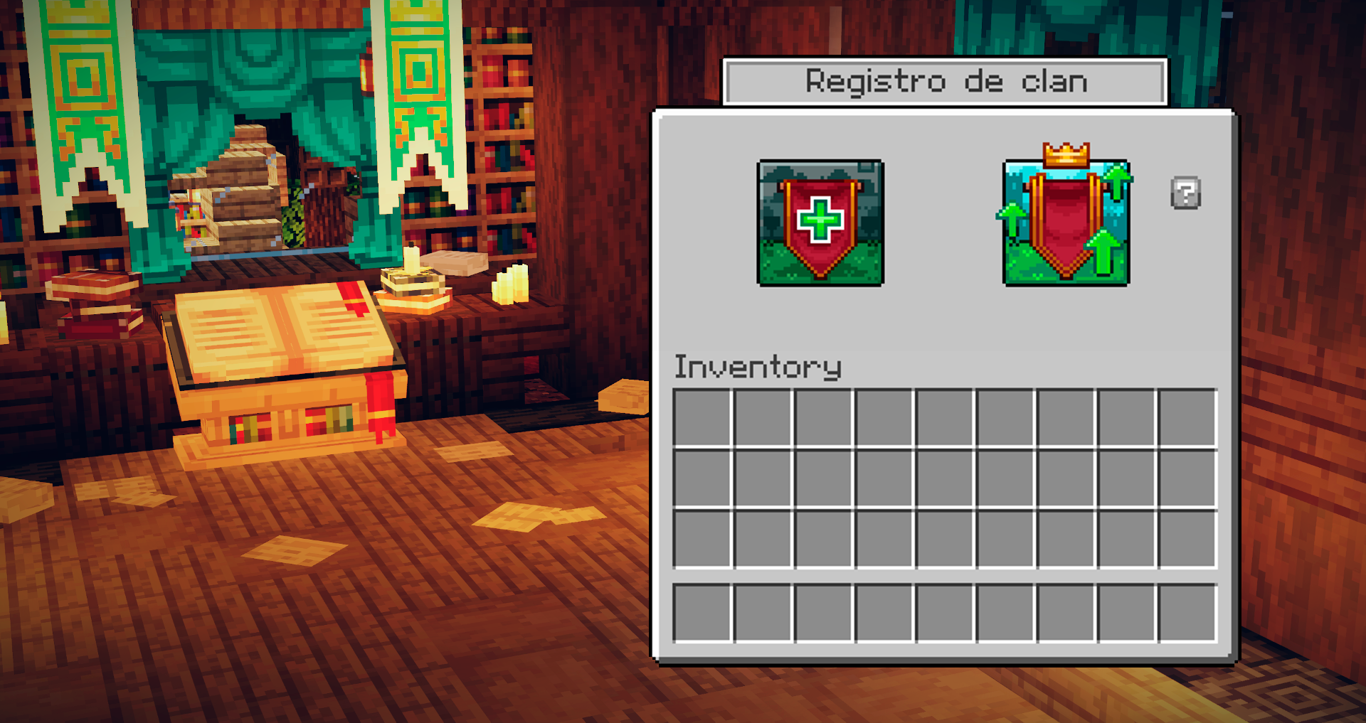 El gran "Texto de registros" en el pabellón del estandarte, lugar donde registrarás tu primer clan.